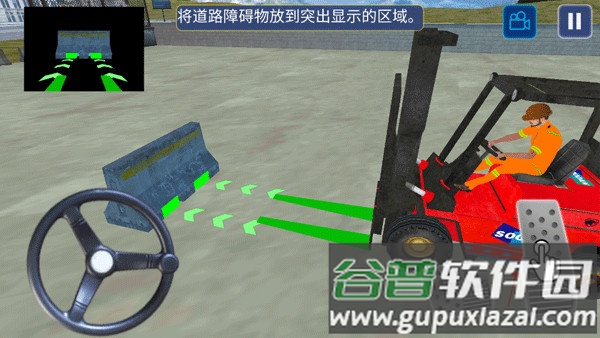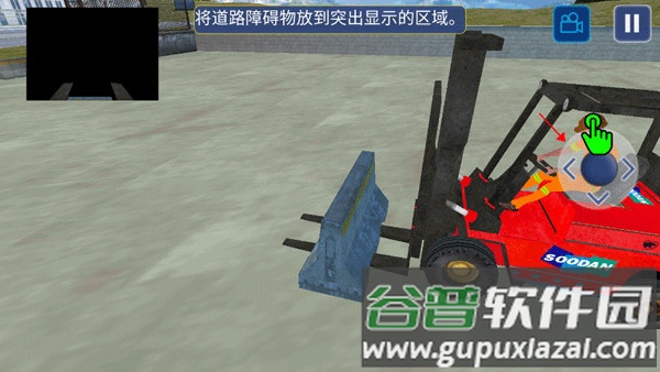 7、将障碍物移至叉车前,点击上升按钮抬起物品,随后放置于箭头所指处;