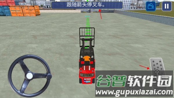 5、第一关目标是跟随箭头指引,操作油门与刹车,将叉车准确停放到指定区域;