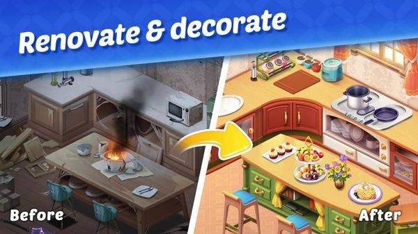 1、结合经典三消玩法,通过闯关消除获取家具与道具,逐步装修整个别墅;