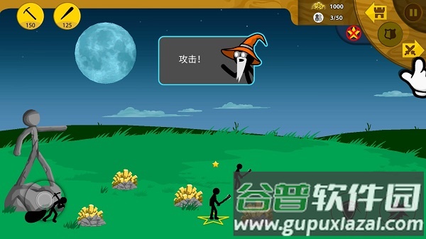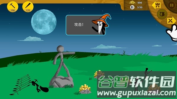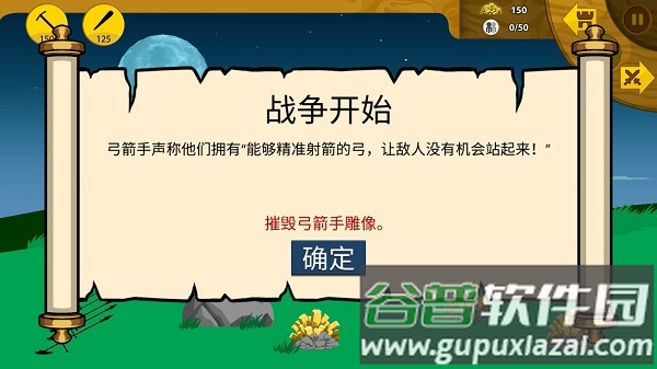 主画面展示战斗场景,屏幕左侧显示我方要塞、雕像与金矿;向右滑动屏幕可侦察敌军动态,预判进攻时机并评估胜算。