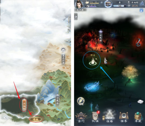 选择云栖谷并前往;向地图左上角移动,找到阿宁并与她对话。