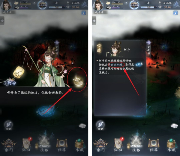 对话结束后,对她使用洞明术;接着继续对话,并点击对话框右上角的“心迹”按钮。