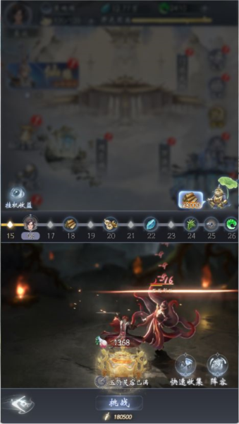 挂机收益;根据当前关卡进度,每隔一段时间可领取一定数量的“五行灵露”,该道具用于提升功体等级。