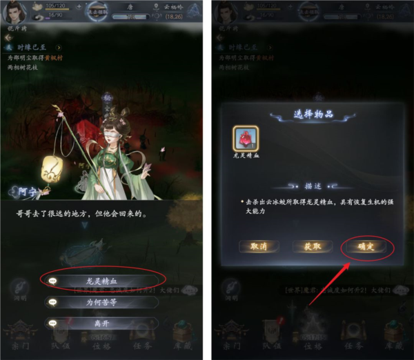 战胜后可获得龙灵精血;再次找到阿宁对话,点击龙灵精血并确认,任务即告完成。