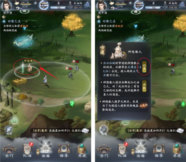 向下移动找到神隐散人,对其使用洞明术;然后可以看到第一条心迹,点击记录。
