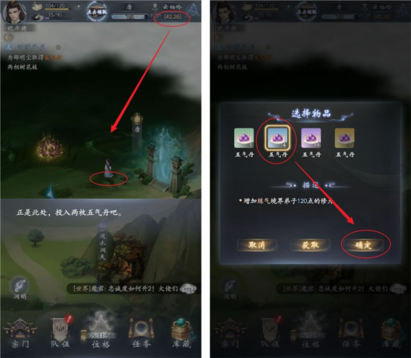 前往坐标(42,26)附近,大约在宗门大门口;投入两枚五气丹。