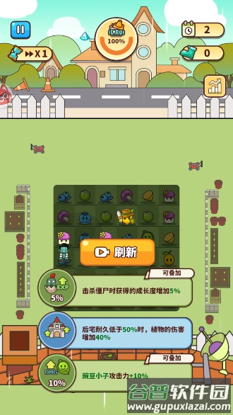 1、蝙蝠菇与芦荟组合,搭配钻石草及玉米,前期清理侧翼目标,后期依靠升级技能制造范围伤害;