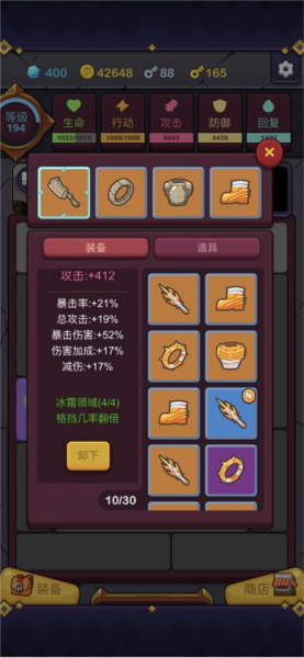 游戏包含四种装备类型,四个品质等级,以及八套装备套装。前两套为布甲与重甲,属于新手过渡装备,在1至10关随意搭配即可通过,且不附带套装效果。