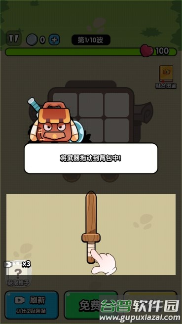 2、将下方获得的武器图标拖动到上方背包格子里,即可装备该武器。