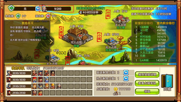 3、每日晚上7:00至10:00期间,抢占城池、消灭其他盟军部队或使用放火技能方可获得积分。