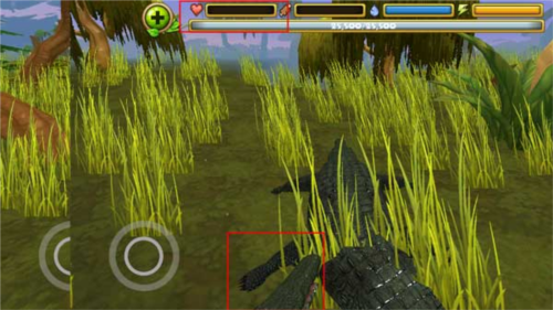1、进入游戏后,玩家以鳄鱼身份开始活动,左侧虚拟摇杆控制移动方向,右侧按键负责攻击,界面顶部显示生命值、饥饿度等状态。