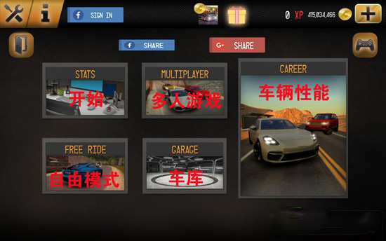 游戏主界面包含多个功能面板,分别对应开始游戏、多人模式、自由驾驶、车库管理以及车辆性能调整等选项。