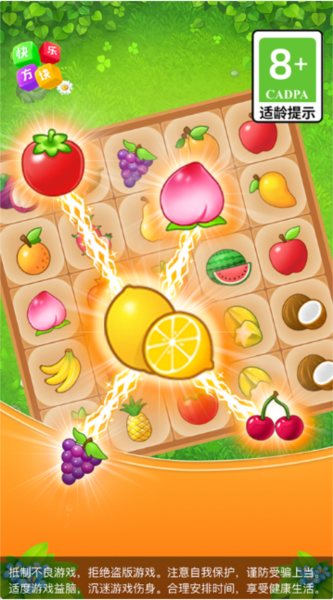 2、除了普通方块,还包含消除水果的模式,会出现梨子、香蕉、桃子、苹果等多种水果元素;