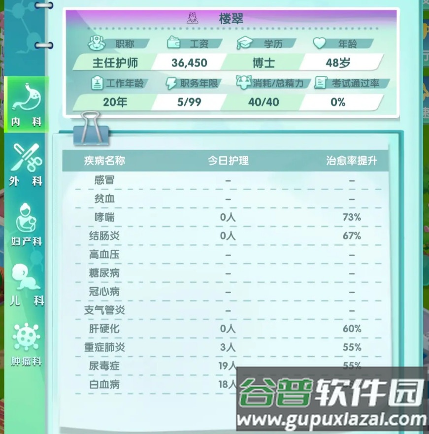 白血病需住院治疗,护士护理能进一步提升医生的治愈率。主任护师可为主任医师治疗该病的治愈率提供55%的加成。若护理率为100%,主任医师的初始治愈率从40%提升至62%。