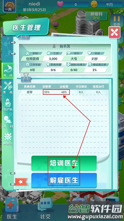 3、聘用医生后,可查看其职业信息与治愈率;若治愈率偏低,可通过培训提升;若水平过低,可直接解聘。