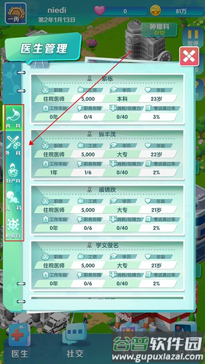 1、游戏包含内科、外科、妇产科、儿科、肿瘤科五类医生,玩家可为各科室招聘人员,扩充医院规模。