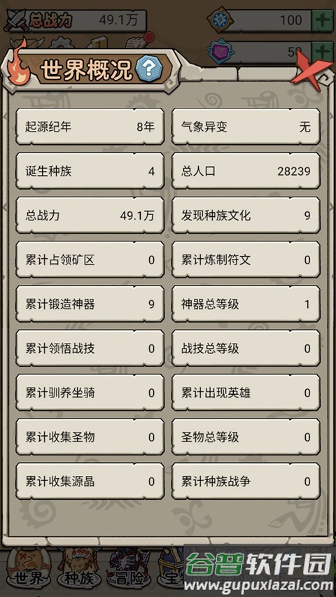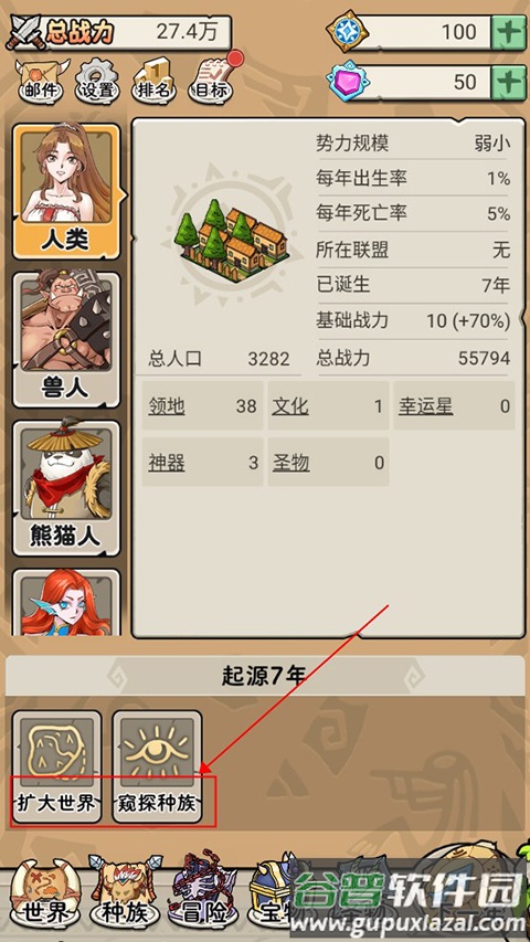 1、游戏开始后,点击起源下方的随机事件,可为种族增加战力或人口等属性。
