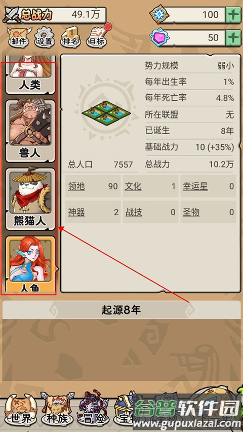 3、游戏中包含多种族体系,初始开放人类、兽人、熊猫人及人鱼四个种族,后续可逐步解锁更多;点击种族卡牌便能查看其详细信息。