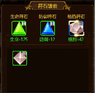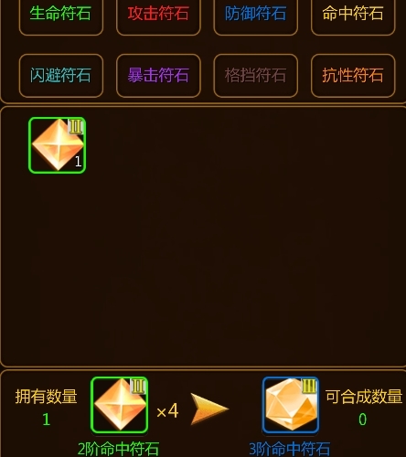 挖掘获得的符石可在工坊合成更高级别,也可直接镶嵌于角色。符石共分八类:生命、攻击、防御、命中、闪避、暴击、格挡、抗性。每四颗同类型同等级符石可合成一颗更高级的同类型符石,高级符石提供的属性加成更为显著。