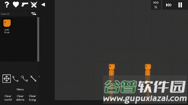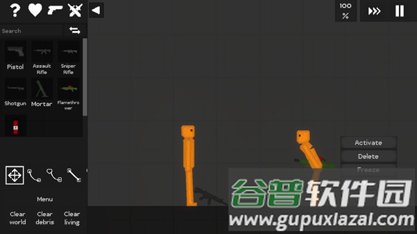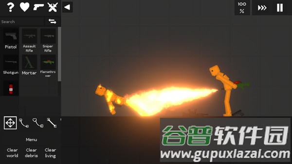 3、喷火器:木材、橡胶、塑料以及角色都容易被点燃;看着它们燃烧并逐渐碳化的过程。