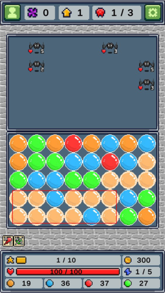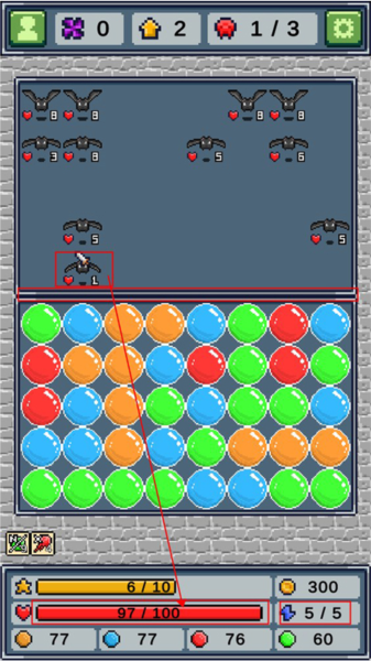 4、管理体力:消除过程会消耗体力,体力耗尽则轮到敌方行动,怪物会向前移动一格;若怪物越过界线将攻击我方并扣除血量,血量归零则游戏失败。