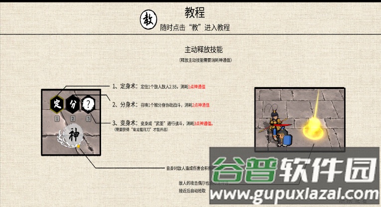 1、定身术:可令单个敌人静止255单位时间,每次使用消耗1点神通值。