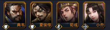 阵容三:典韦、夏侯惇、荀彧、小乔。典型的反击盾兵组合,前期伤害可能不突出,但凭借坚固防守往往能赢得最终胜利。