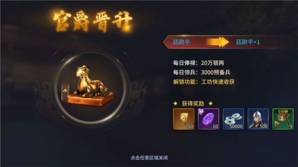 初期请全力提升官爵等级,这能帮助你熟悉游戏并解锁城建等重要功能。有个细节需要注意:尽量先将官爵提升至当前上限,再去领取每日兵员与俸禄,以实现收益最大化。