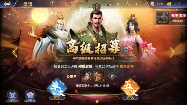 高级招募的心愿单机会宝贵,建议重点用于两方面:一是培养已上阵武将以快速升星;二是解锁关键雄才,例如大乔;因为早期橙色弓兵稀缺,而弓兵又是阵型必需,且大乔雄才无需悟道石,易于升级,对攻打领地与完成奇遇帮助显著。