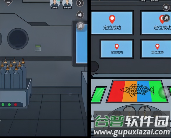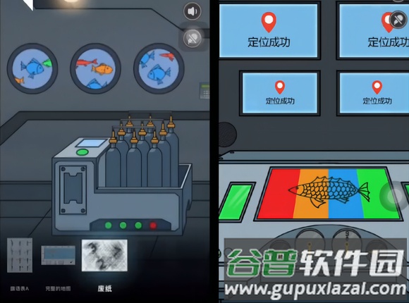 4. 对照左右两侧鱼类板块的颜色与数量关联,得出密码牌密码2241,救生梯随之出现;