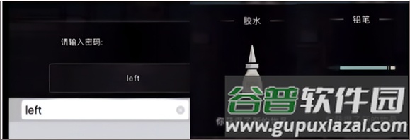 3. 左侧柜子颜色与右侧操作台对应,输入对应字母“left”打开柜子,取得胶水与铅笔;