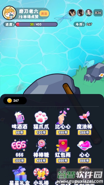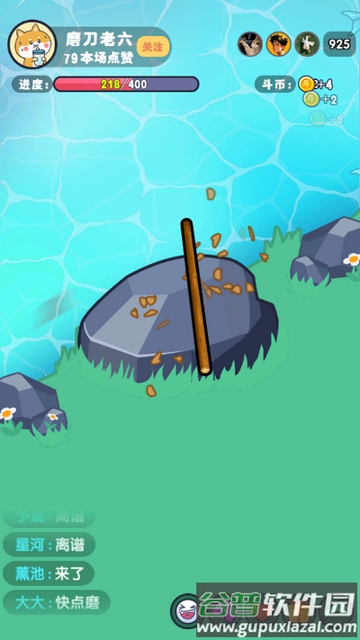 河边磨个针是一款休闲模拟小游戏,核心玩法是让玩家在小河边的石头上将不同材质的棒子磨成细针。每完成一根针就能解锁新的棒子,通过持续滑动屏幕即可推进打磨过程;游戏还加入了直播互动元素,玩家可以通过购买虚拟礼物来加速磨针进度,配合轻松的音乐,带来一段悠闲的体验。