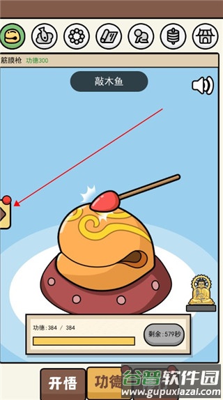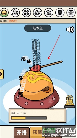 2、轻触屏幕即可敲击木鱼进行修行,初始功德值为10点,并会随时间缓慢减少;