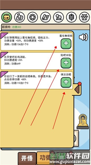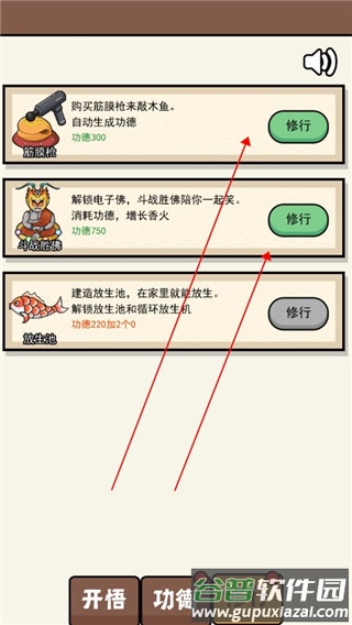 5、功德提升后进入修行界面,在此购买能提高效率的道具,例如筋膜枪、电子佛、功德加成等;