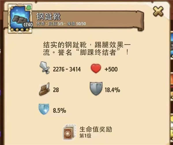 靴子:钢趾靴,提供18.4%物理抗性与8.5%魔法抗性,同时增加一定攻击力。