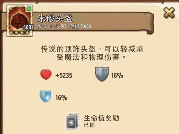 头盔:朱砂头盔,提供16%的双抗加成及生命值属性,外观也较为美观。