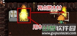 3、在火堆前使用木棒取得火焰,再点燃附近的木材堆,门将随之打开,即可进入下一个洞穴。