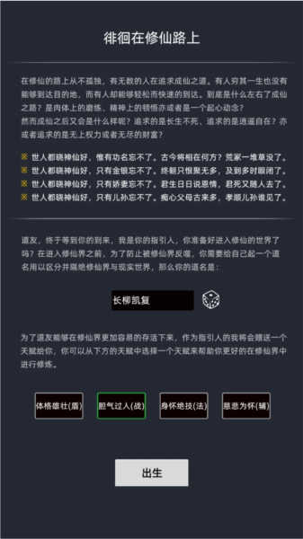 你出身贫寒,幼时被弃于富户门前,幸得一位游历修士带回宗门抚养。在门派中修得功法,却因久离尘世,始终难悟“道法自然”的玄机,修为停滞不前。于是你决意下山,踏入纷扰人间,体味冷暖百态,寻求属于自己的道。