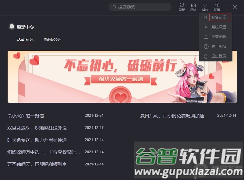 第一步:打开PC版炽焰加速器,点击右上角设置中的实名认证选项。
