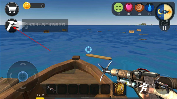 3、收集木材、金属等各类材料,不断改造并强化你的木筏,使其能够应对狂风巨浪;