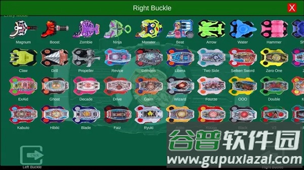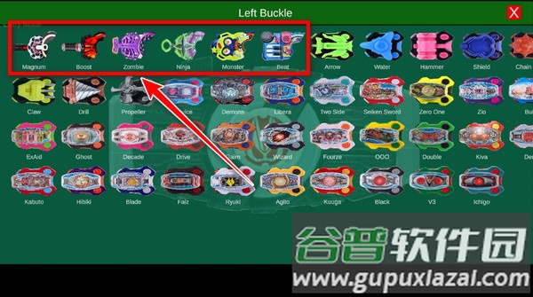 4、优先设置左侧带扣,在打开的选项页面中挑选款式;主要骑士带扣排列在前,后续包含假面骑士其他系列的联动音效带扣。