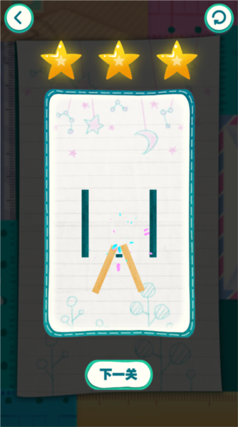 3、以关卡闯关为核心,根据完成情况给予星级评价;后续关卡难度逐渐提升,持续激励玩家挑战,通过切割绳索、移除障碍来帮助小球碰撞,过程有趣。