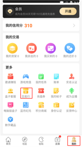 1、打开996盒子app,进入个人中心页面,找到并点击交易行功能入口。