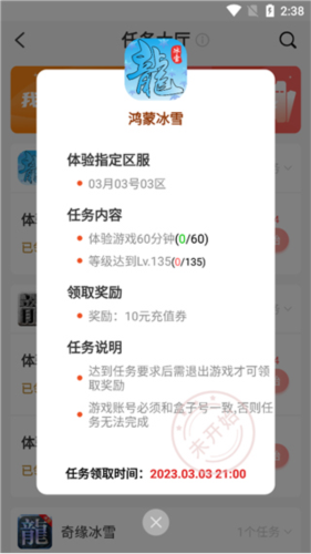 3、请注意,每个任务都有指定的游戏区服要求;达成任务目标后,退出游戏即可领取奖励;接取任务使用的游戏账号必须与盒子绑定账号一致,否则无法完成验证。