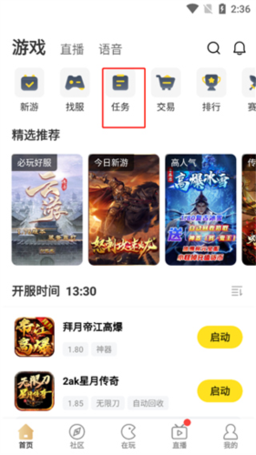1、打开996盒子app,进入游戏首页,可以看到新游推荐、找服、任务、交易等板块,点击任务入口。