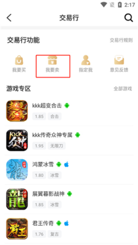 2、在交易行界面中选择我要卖选项。