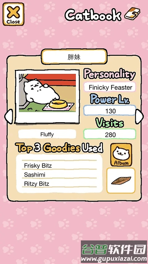 下方区域展示这只猫最喜爱的道具排名,旁边是相册入口与已收礼物列表。
