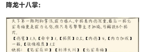 3. 属性加点方面,打狗棍法与降龙十八掌均对臂力要求最高;建议采用6111的分配方案,此分配需以280点初始属性为前提,否则臂力难以达到60点。