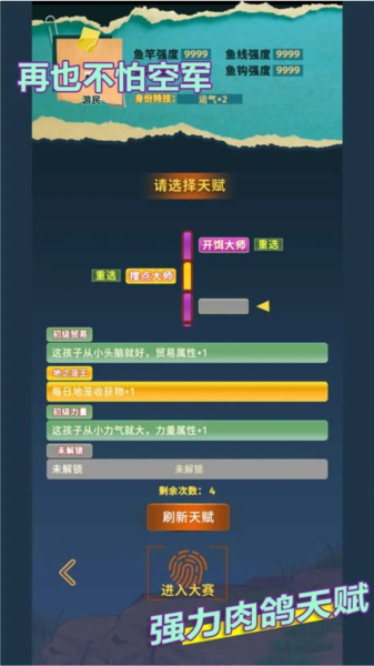 另介绍两个特色天赋:1.武器大师系列。效果具有两面性,能保证装备强度,但不宜装备过多,否则在晋级赛或决赛中可能因装备品质不足而陷入困境;喜欢打卡机的玩家应避免随机鱼钩效果。2.占星骰子。游戏逻辑先判定鱼类星级,再判定重量;理解这点后,骰子带来的重量波动就充满乐趣,是许多人遇到便会选择的天赋。