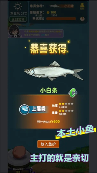 1、上手迅速:核心玩法一分钟即可掌握,过程简洁流畅;省略了等待与诱鱼的冗长环节,每次抛竿都有鱼口,关键在于能否成功刺鱼。
